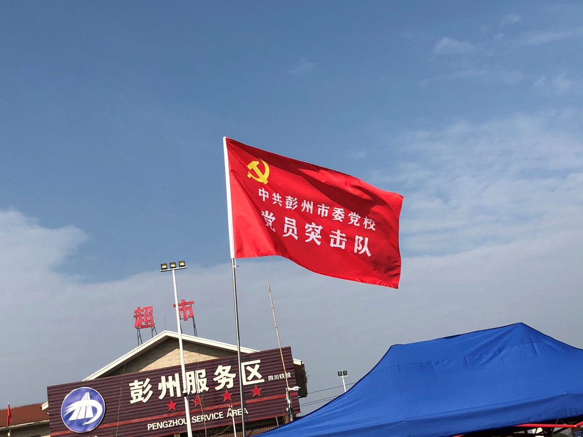 一名党员就是一面旗帜。2月7日晚9时,彭州党校党员突击队旗帜在成绵高速复线彭州服务区飘扬起来,14名党员重温入党誓词,在寒风中开始了每日12个小时的卡点防控。8名金堂党校人戴上党徽,坚守在城南高速竹蒿出口防疫卡点。温江党校人则每天协助客运站消毒。