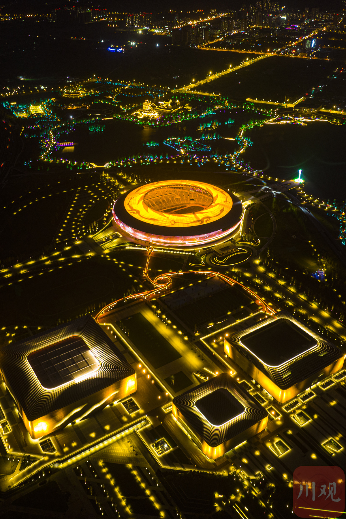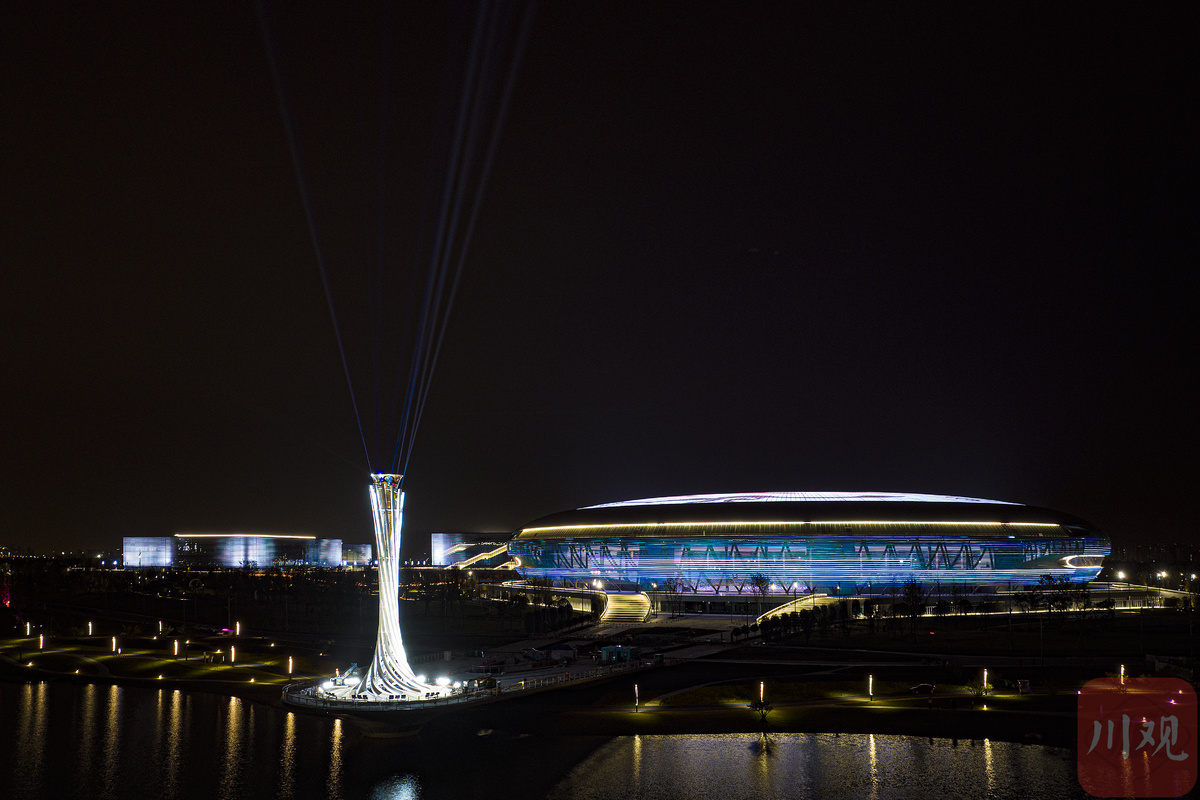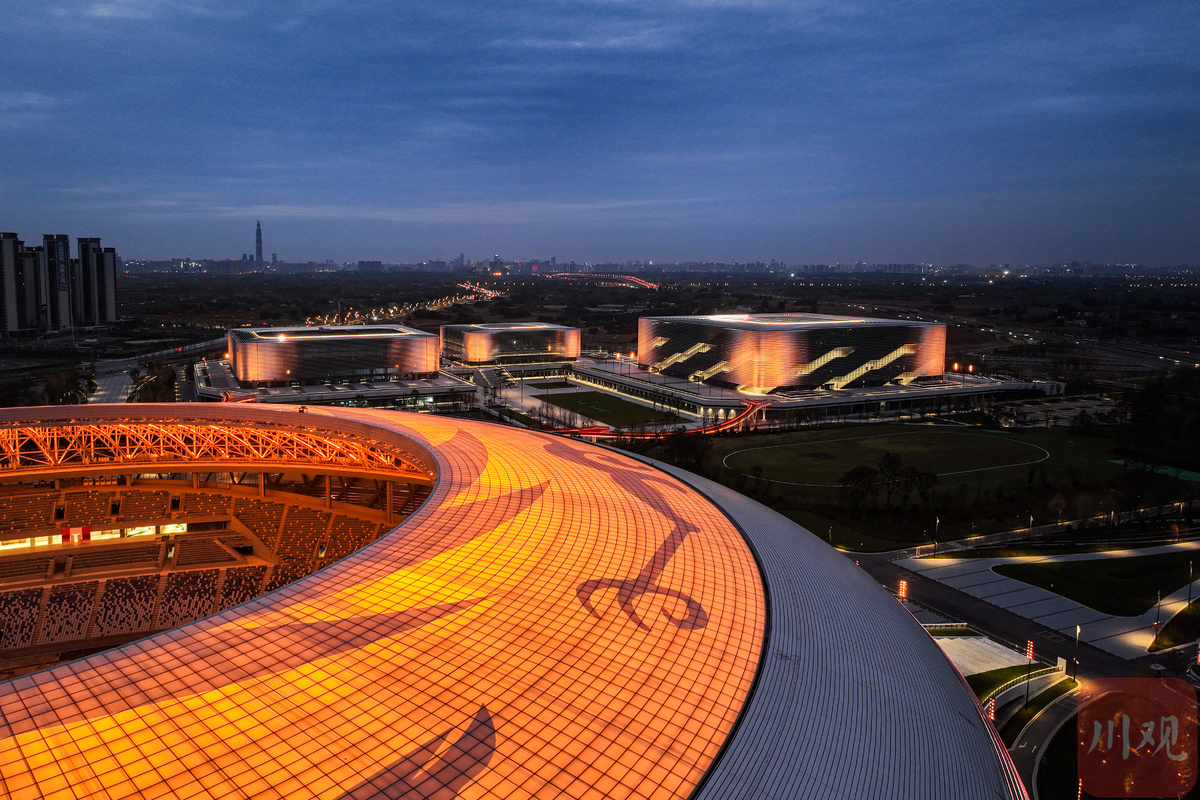 成都大运会“一场三馆”(主体育场、游泳跳水馆、多功能体育馆、小球馆)的泛光照明系统随即亮起。东安湖体育公园在灯光映衬下展现出建筑本身的特色,四只神鸟在主体育场穹顶的太阳图案边盘旋,夺目的灯光与成都璀璨的夜空完美融合。