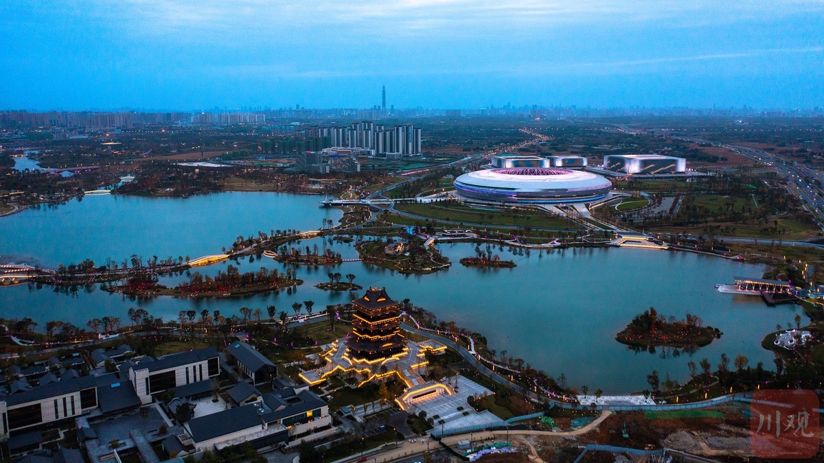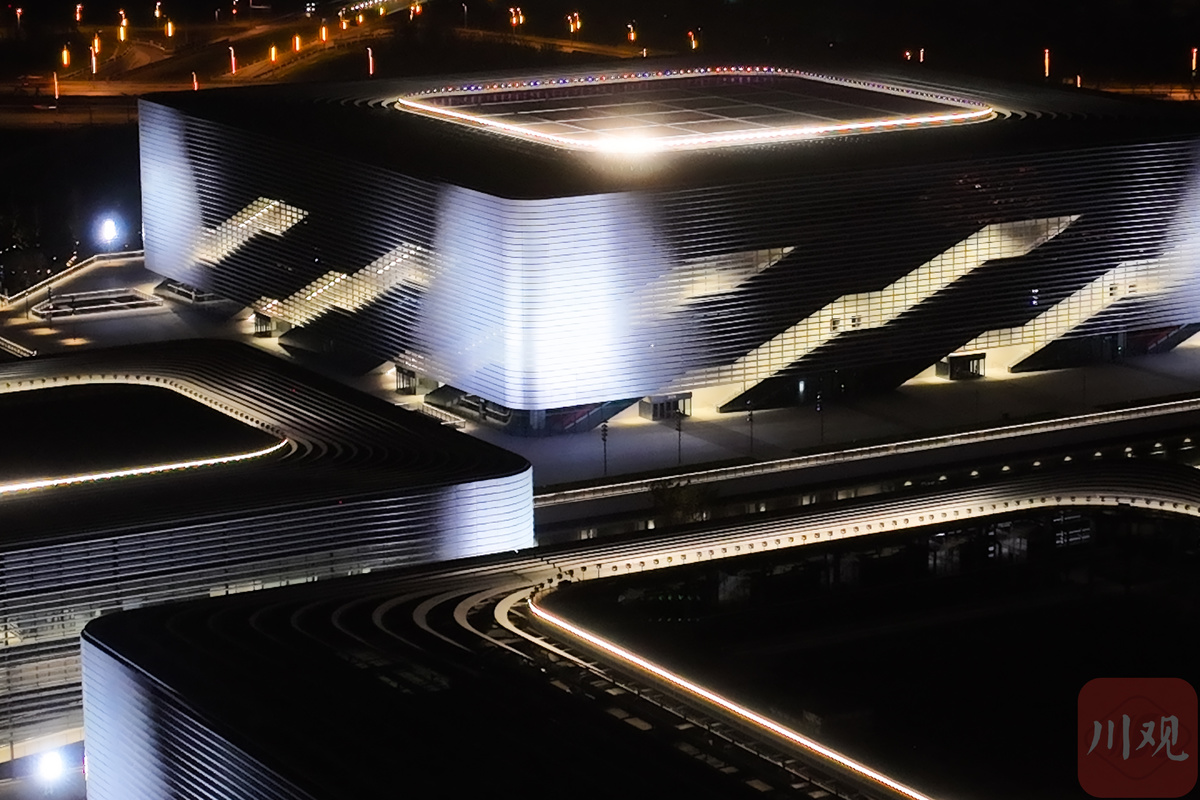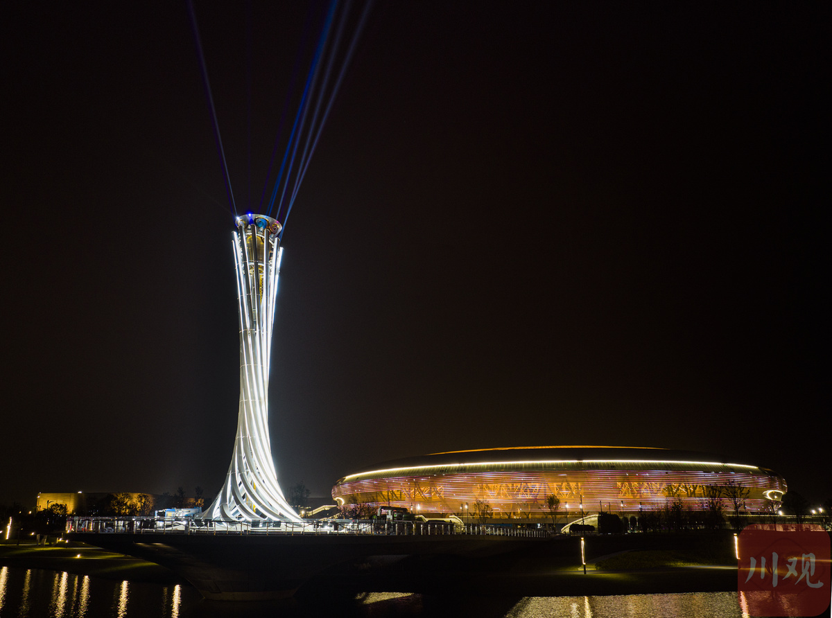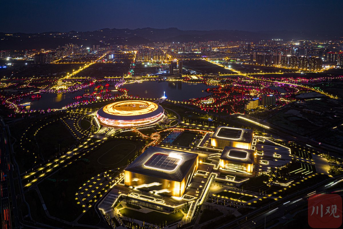 成都大运会“一场三馆”(主体育场、游泳跳水馆、多功能体育馆、小球馆)的泛光照明系统随即亮起。东安湖体育公园在灯光映衬下展现出建筑本身的特色,四只神鸟在主体育场穹顶的太阳图案边盘旋,夺目的灯光与成都璀璨的夜空完美融合。