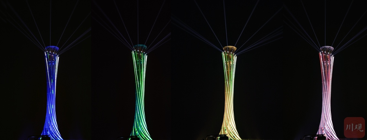 随着夜幕降临,一道道光束从成都大运会主火炬塔发出,划破天际,点亮夜空。