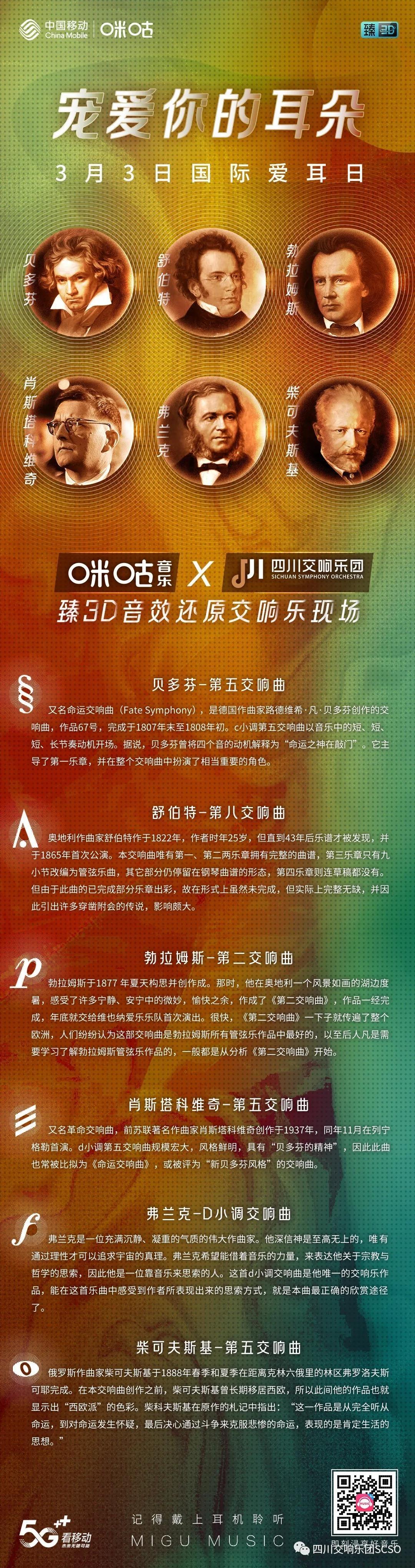 3月3日的“国际爱耳日”。四川交响乐团联手中国移动咪咕音乐,共同在国际爱耳日当天推出臻3D交响乐主题曲目,音乐内容包括贝多芬、舒伯特、勃拉姆斯、肖斯塔科维奇、弗兰克、柴可夫斯基等多位国际大师名曲佳作。高品质3D沉浸式音效产品,区别于传统音乐平台均衡器插件模式,是唯一对音源引入(除技术处理外)人为声音艺术设计和声场定制,实现沉浸式环绕体验的音频技术和方法。