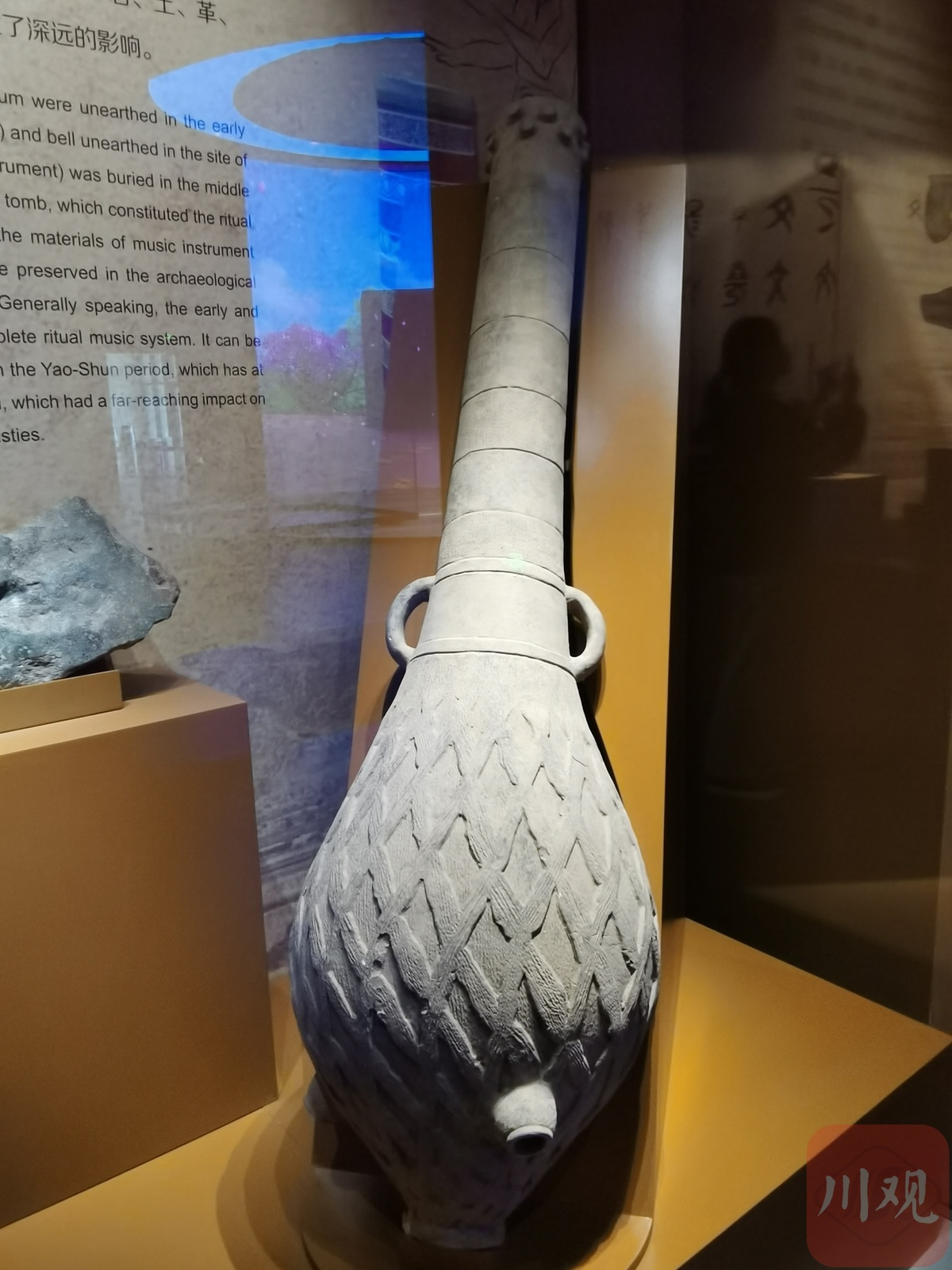 大量的乐器和礼器,也出现在陶寺的高等级墓葬中。在临汾博物馆,可以看到土鼓、铜铃等乐器。经统计,陶寺出土的乐器共有29件,包括了鼍(tuo)鼓、特磬、口弦琴等多种。考古人员发现,鼍鼓这种用鳄鱼皮蒙的鼓,只出现在王级大墓里,和磬、土鼓呈固定组合放置于墓主左下侧,应是高等级人群才能享有的陪葬品。此外,陶寺还出土了玉钺、玉琮、玉璧等体现王者身份的玉礼器。这些乐礼器的发现,说明陶寺时期礼乐文明已初步形成。尤其值得一提的是,鼍鼓和特磬传承到了商周,是身份高贵的王者之器……