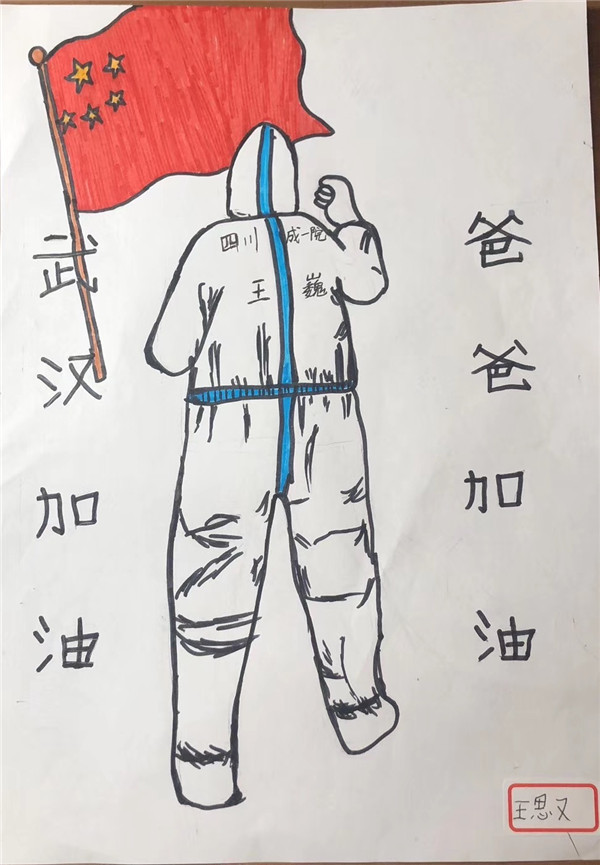 王巍说,参与对新冠肺炎患者的救治,这是自己份内的事情。可是很多人不知道,王巍的妻子在国家救灾物资储备中心工作,因为疫情,最近一直在单位战备值班。王巍要奔赴湖北支援,他们刚刚上小学的女儿只能托付给父母。凌晨2点得到通知,早上7点就要出发,在外隔离的王巍没法回家与女儿告别。后来在得知爸爸已经前往湖北支援后,女儿王思又特意画了一张画,上面写“武汉加油、爸爸加油”为他鼓劲。
