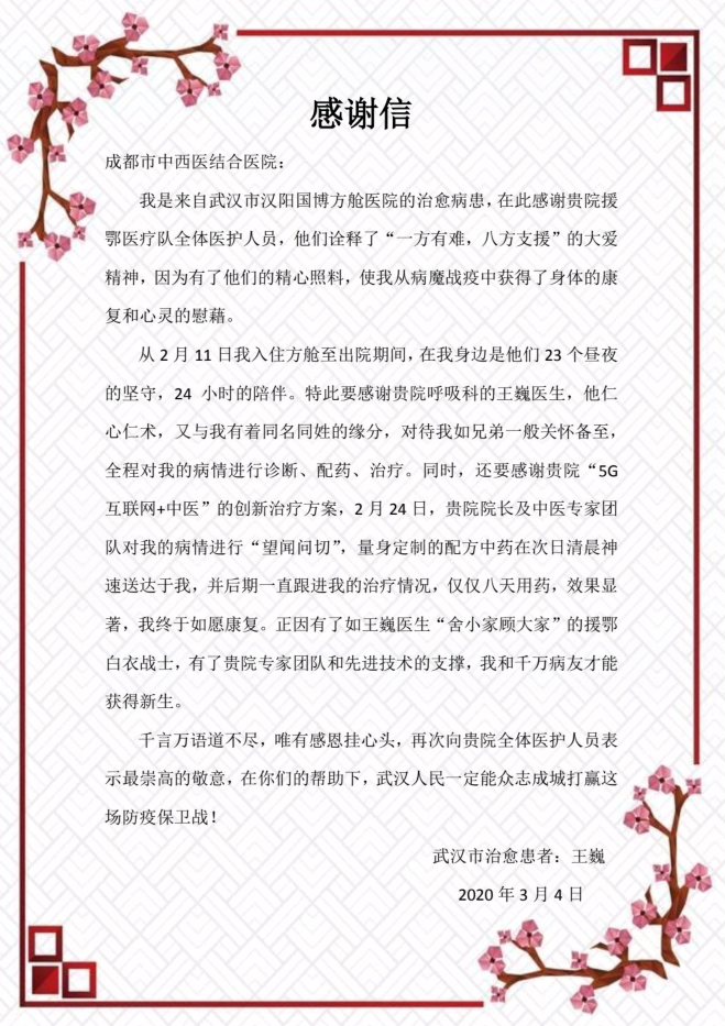 在精心护理之下,王巍的病情得到了控制并逐步好转,仅仅用8天的时间,他就达到了出院标准。3月4日,他走出了武汉市汉阳国博方舱医院。离开医院之时,病人王巍很是不舍。为此,他专门给医生王巍以及成都市第一人民医院写了一封感谢信。他在感谢信中写道:“王巍医生,他仁心仁术,又与我有着同名同姓的缘分,对待我如兄弟一般关怀倍至,全程对我病情进行诊断、配药、治疗……正因有了如王巍医生’舍小家顾大家’的援鄂白衣战士,我和千万病友才能获得新生。”