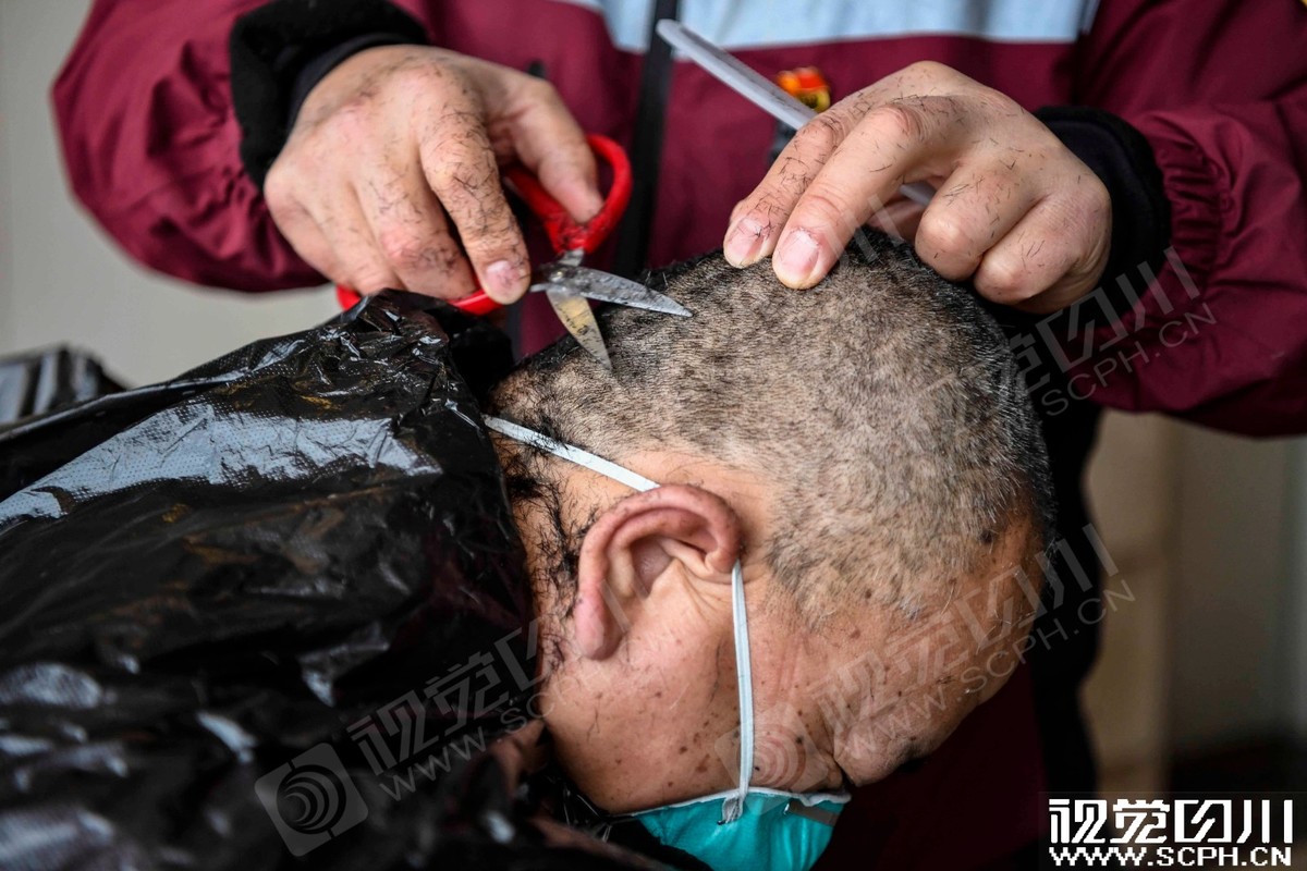 2月6日,在武汉东西湖区 驻地,为了减少感染风险,四川国家紧急医学救援队队员丁少夔在队友的帮助下剪成了光头。
