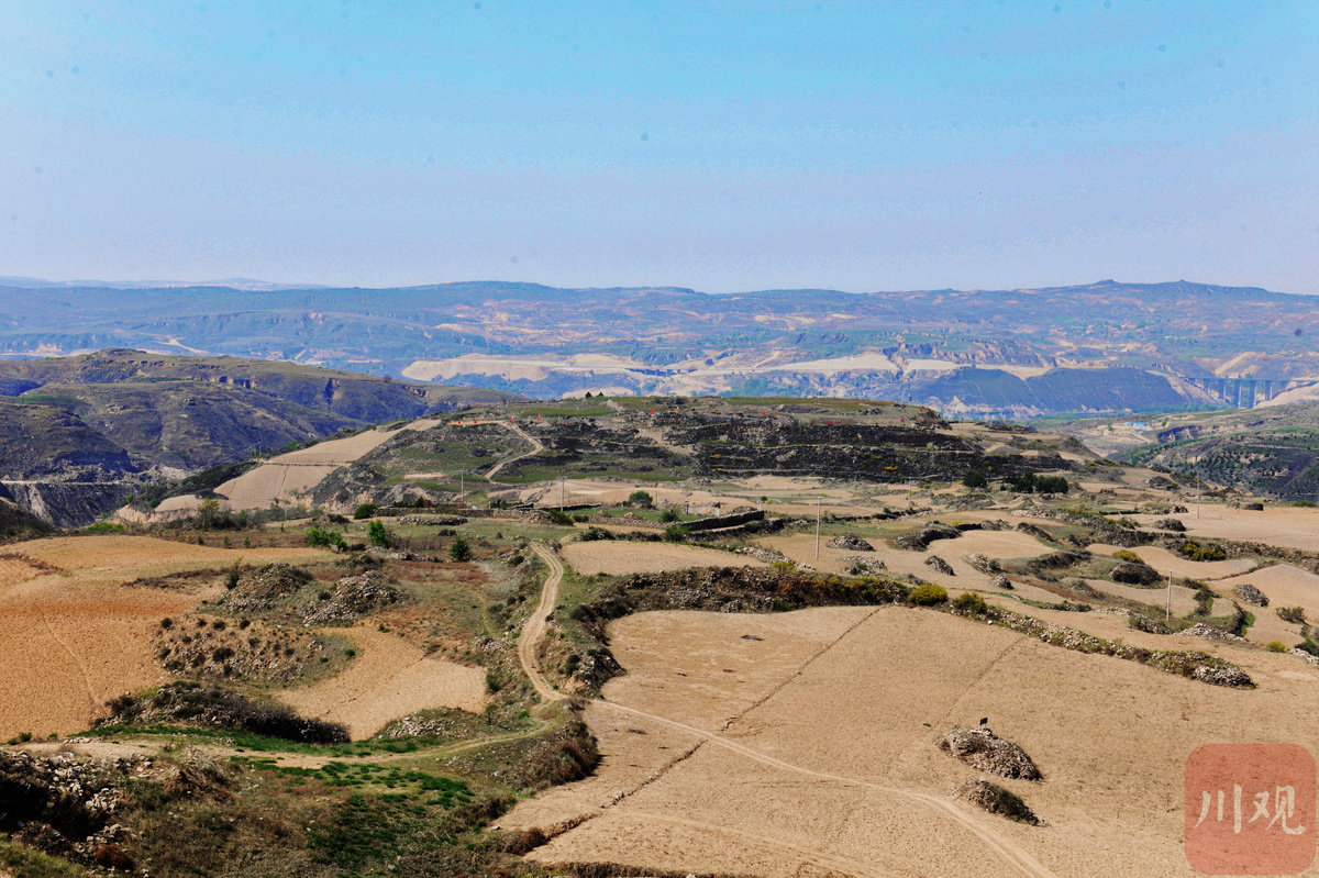 这处遗址位于榆林神木市高家堡镇,地处黄土高原北部、毛乌素沙漠南缘的黄河一级支流秃尾河及其支流洞川沟交汇的台塬梁峁之上。7月,我们开启了对它的寻访。黄土高原沟壑纵横,呈现出和成都平原全然不同的苍凉地貌。在蜿蜒的盘山公路上一路攀爬,秃尾河北岸山峁上,一座盘延在山梁之上的古城,开始闯入眼帘。