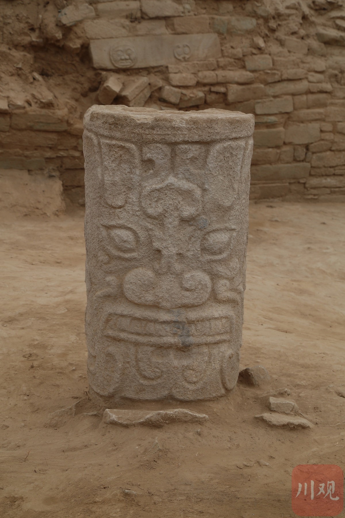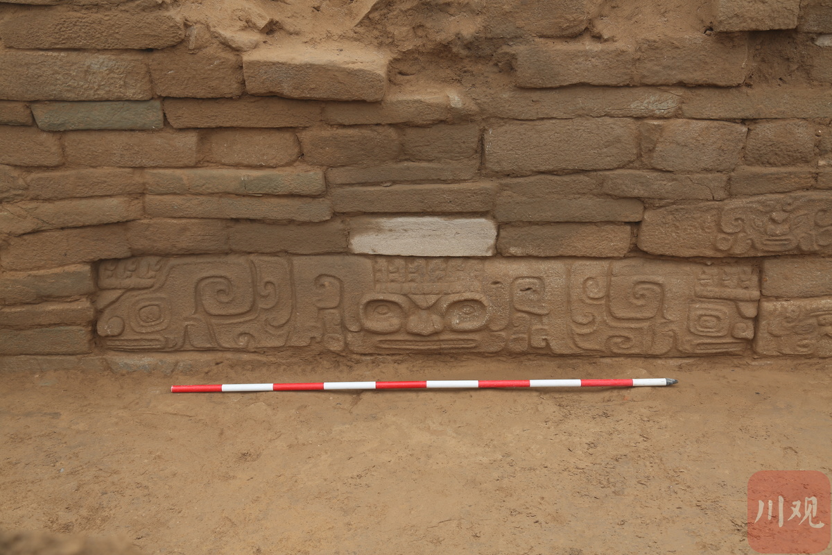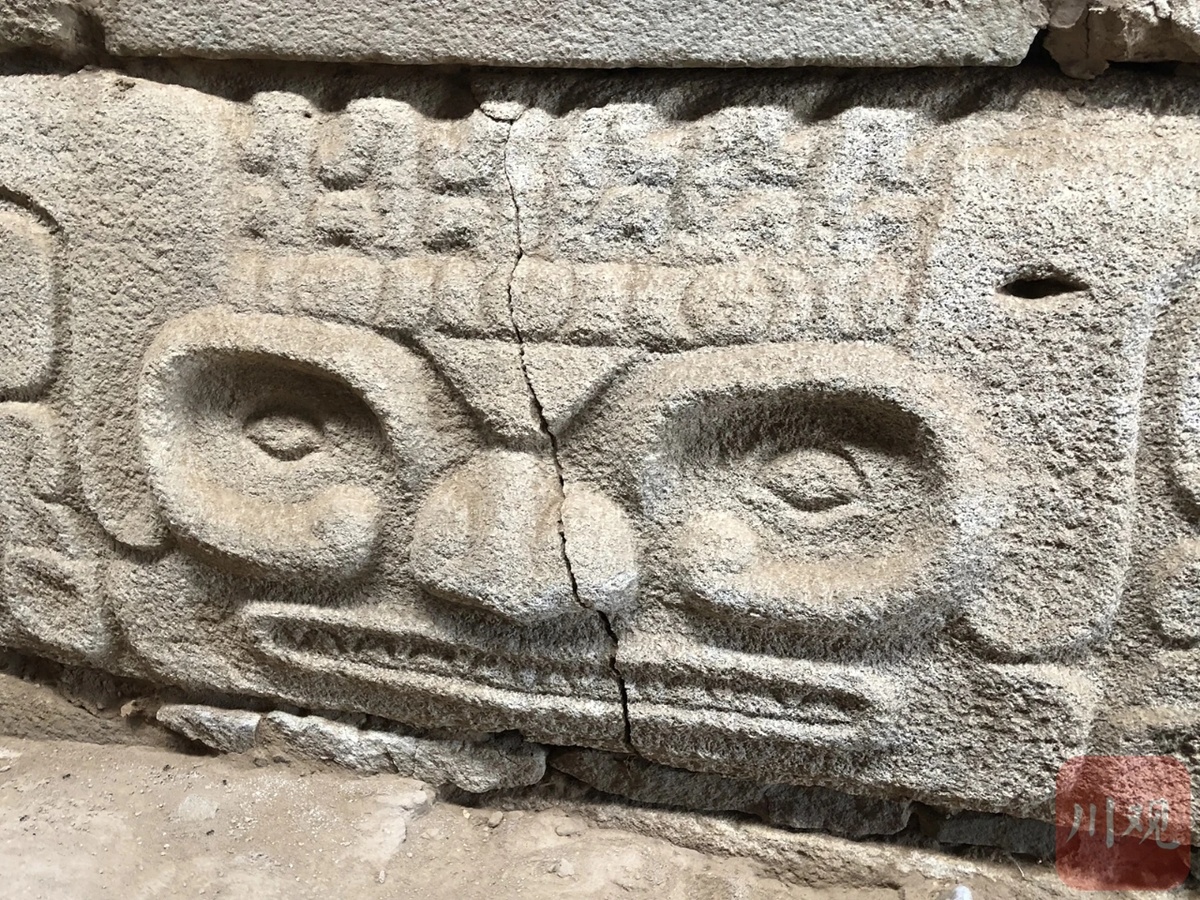 周边石墙上,可以看到偶有石雕装饰。2018年,考古人员在清理这片护墙时,一共发现了70多件石雕,大部分出土于倒塌的墙体石块内,但仍有部分镶嵌于墙面之上。现场可以看到,这些石雕既有菱形的眼状装饰,也有神人面、动物等形象,呈现出成熟的艺术构思和精湛的雕刻技艺。