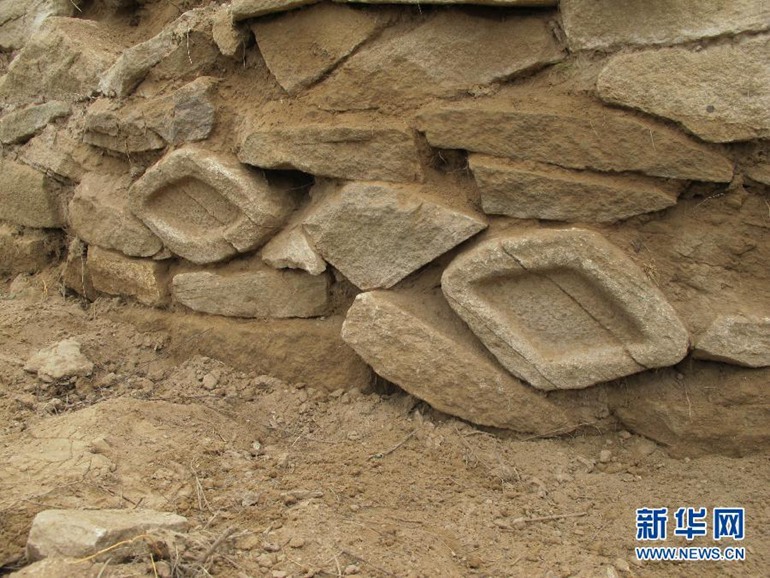 石峁遗址城墙上的石眼,由新华社记者冯国摄影