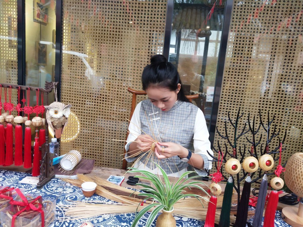 “90后”道明竹编传承人杨隆梅,则以娴熟的技艺教大家编起竹编小果盘。镜头里,杨隆梅的一双巧手不停翻飞,横向和纵向摆齐的竹篾在指尖一挑一压下,渐成规模。最后,她把四边的竹篾分别收拢捆绑好,一只漂亮的小果篮就完成了。短短三四分钟的视频,网友纷纷表示没想到竹编如此简单易学,更有人看上视频里作为背景的熊猫图案瓷胎竹编瓶,喊出雄心勃勃的口号:“我觉得自己离编熊猫只差购买竹篾了。”