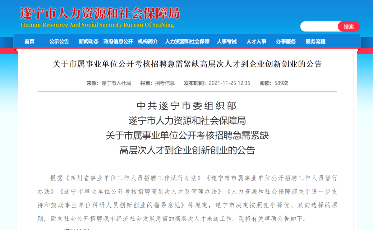 本次考核招聘采取网络报名的方式进行,从公告发布之日起至2021年12月10日17:00前,报考者可登录“遂宁市人力资源和社会保障局”门户网站阅读公告,选择符合报考条件的岗位。