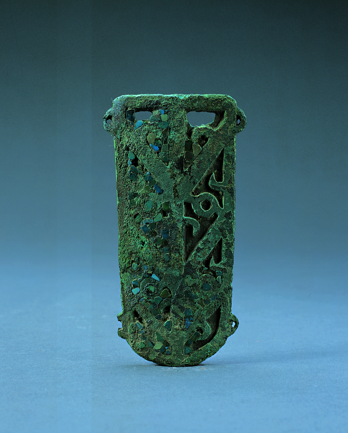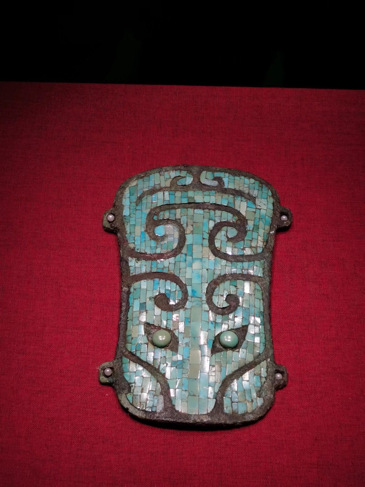 二里头遗址出土此类铜牌饰共3件,形制大同而略有小异。青铜牌架之上镶嵌有数百枚方、圆或不规则的绿松石,几乎没有脱落。它们出土时均置于贵族墓葬中墓主胸口处,可能是象征身份地位的装饰品。三星堆出土的其中一块镶绿松石铜牌石外形和二里头大体相似,但铜牌锈饰严重,镶嵌的绿松石也有松动脱落,显然二里头的镶嵌工艺更加精湛。