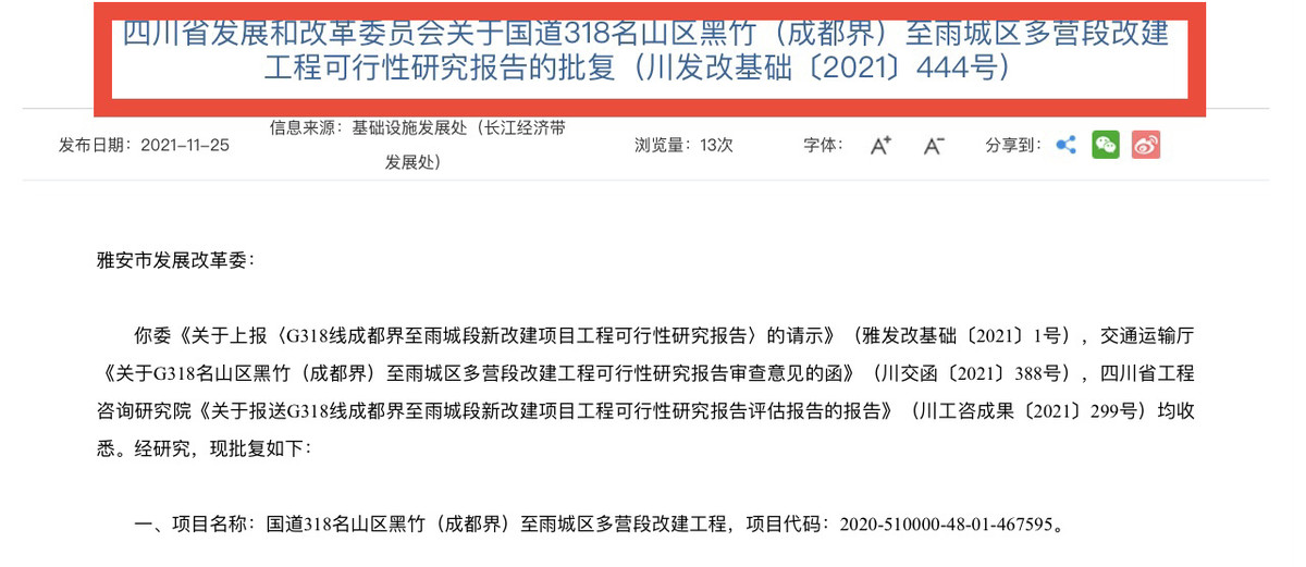 另一获批的国道318名山区黑竹(成都界)至雨城区多营段改建工程,为改善区域交通条件,提升雅安城区节点通行能力,支撑雅安高水平建设川西综合交通运输枢纽而建设。