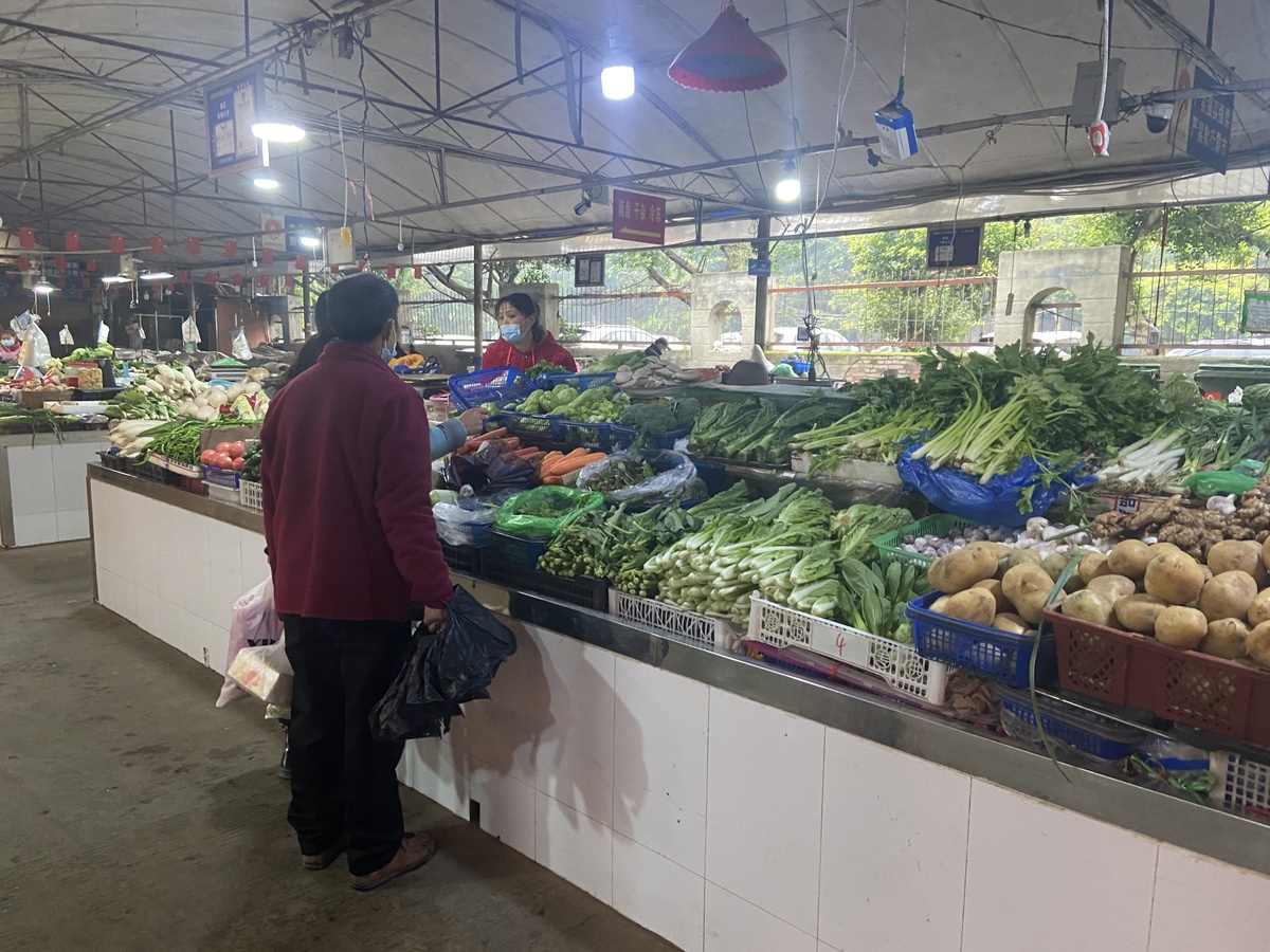 菜贩黄慧东的摊位在会龙农贸市场最里面,芹菜5元/斤、豌豆尖7元/斤、西兰花7元/斤……和上月相比,价格有所下跌。“黄瓜最高的时候一斤要8元,现在就卖5元。”黄慧东从成都农产品中心批发市场(又名:白家市场)进的货,批发价跟之前比便宜了不少。