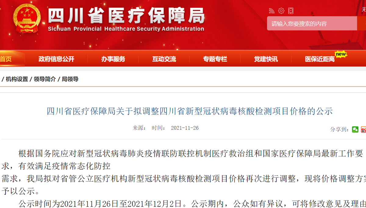 11月27日,川观新闻记者从四川省医疗保障局了解到,根据国务院应对新型冠状病毒肺炎疫情联防联控机制医疗救治组和国家医疗保障局最新工作要求,有效满足疫情常态化防控需求,四川拟再次下调省管公立医疗机构新冠核酸检测项目价格,单检40元/人次,混检(5混1、10混1)10元/人次。