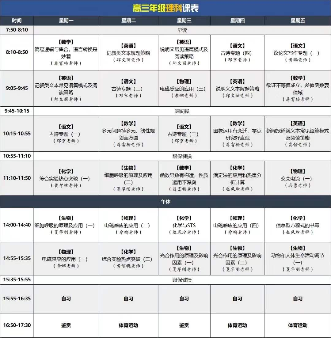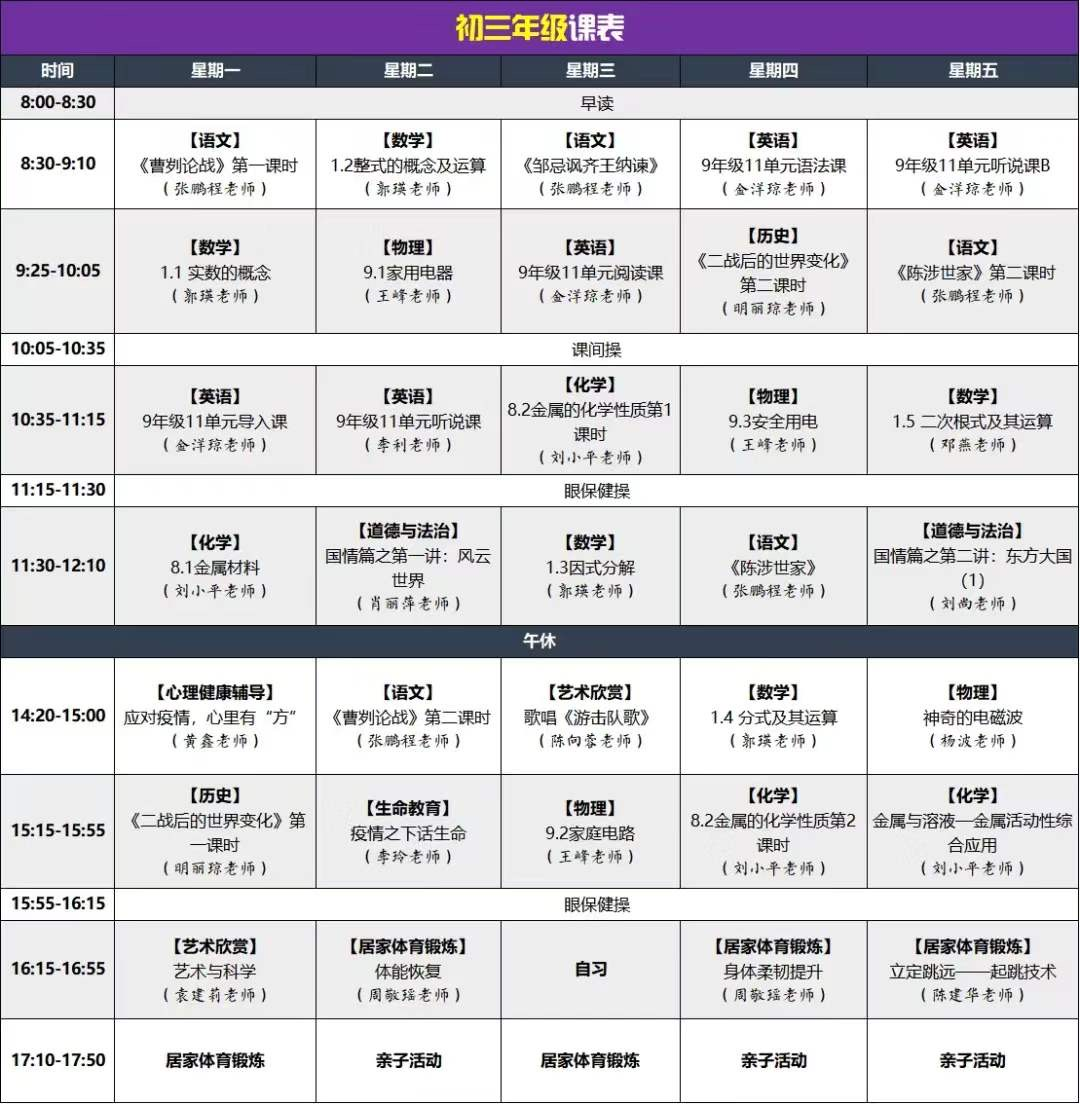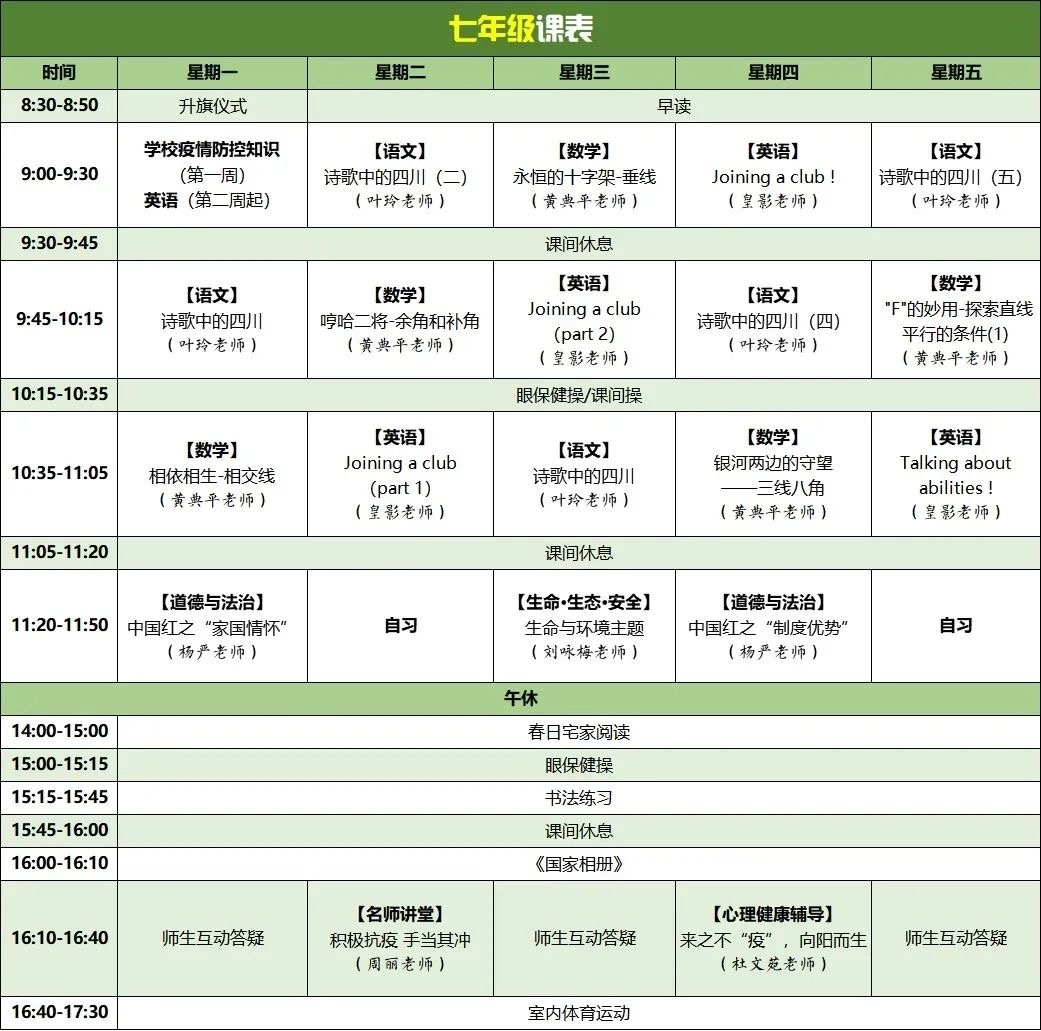 初三、高三年级课程由成都市教科院打造的成都数字学校提供。以下课表根据成都数字学校课表编制。