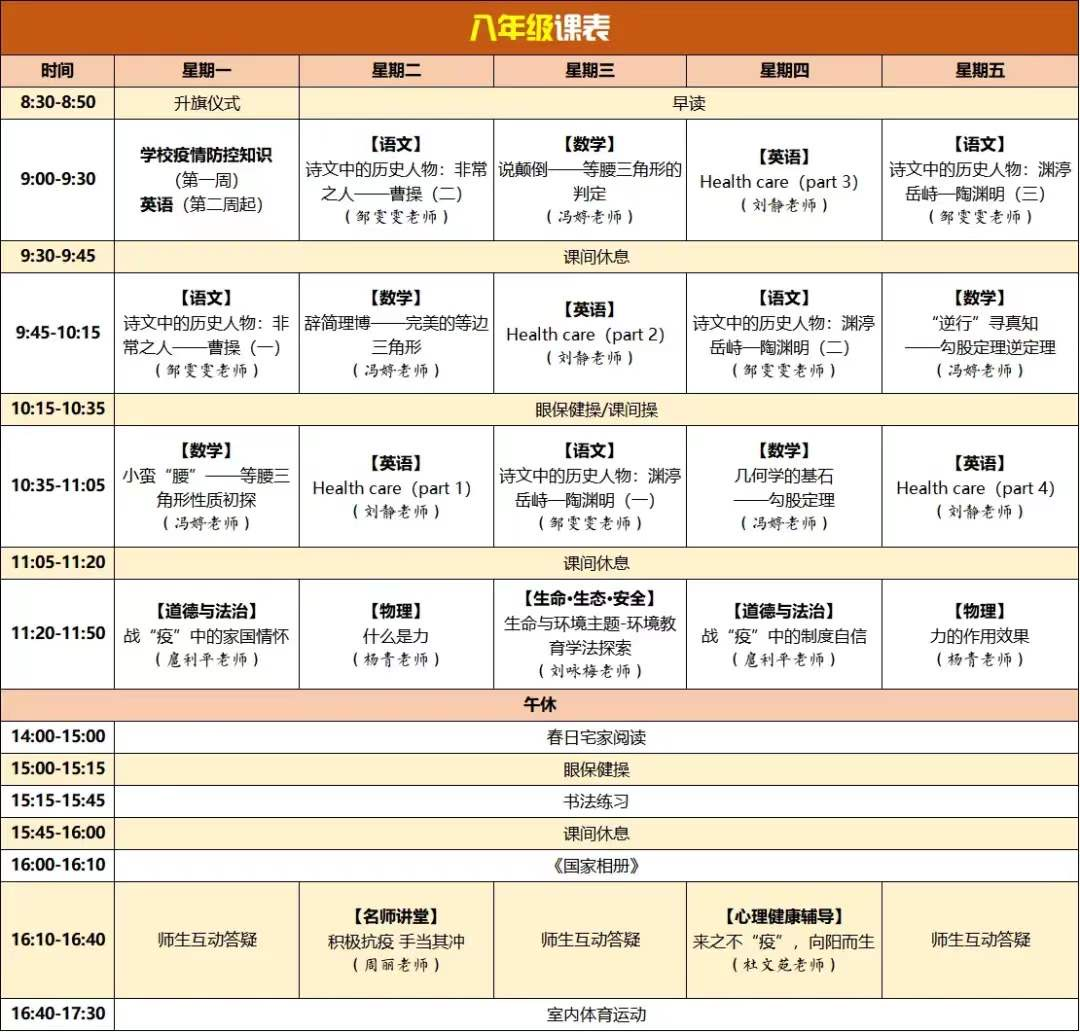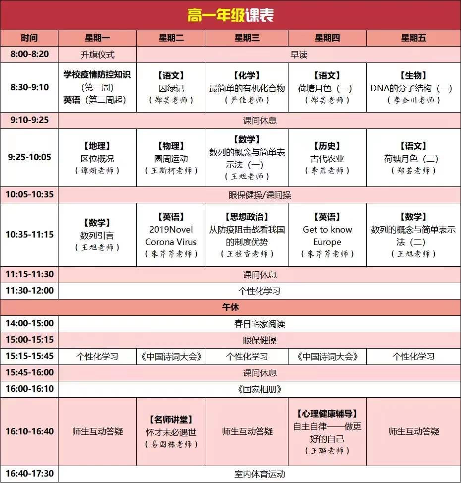 1.中学课表供我省疫情防控延期开学期间七年级、八年级使用。高中课表供我省疫情防控延期开学期间高一年级、高二年级使用。