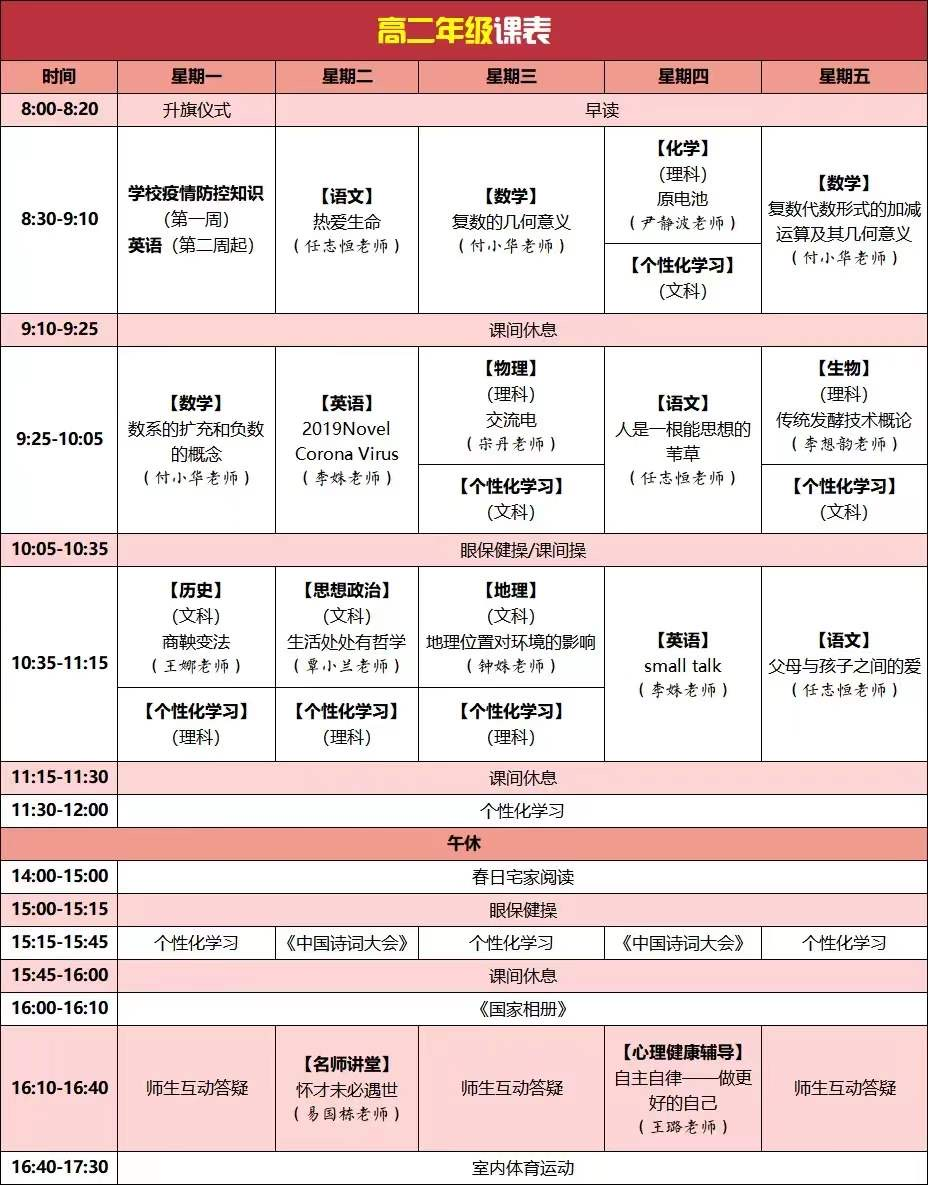 4.中学线上教学上午主要安排学科教学,每天学科教学不超过4节课,每节课40分钟,每节课教师讲授时间不超过20分钟。下午为素质拓展类课程/活动。
