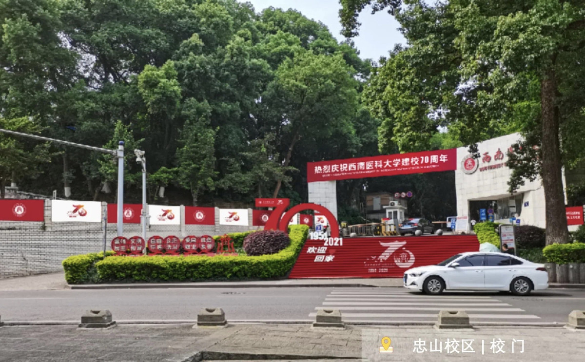 在忠山校区,已被红装包裹的校门让西南医大人的记忆瞬间涌上心头。“亲爱的校友,欢迎回家。”“1951—2021,我们的故事从忠山开启”……一处处校庆景观标语的背后,承载着西南医大和广大师生、校友间深厚的爱与期盼。