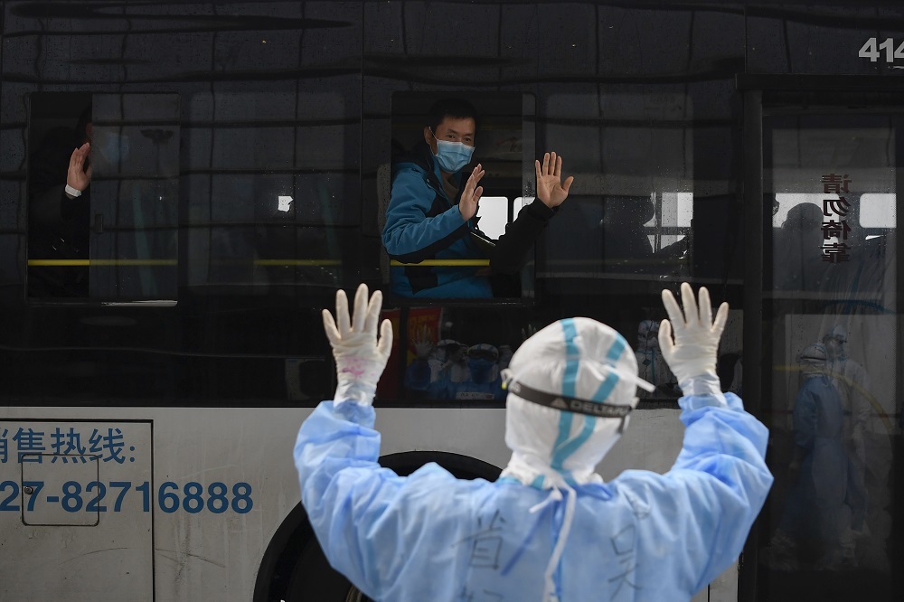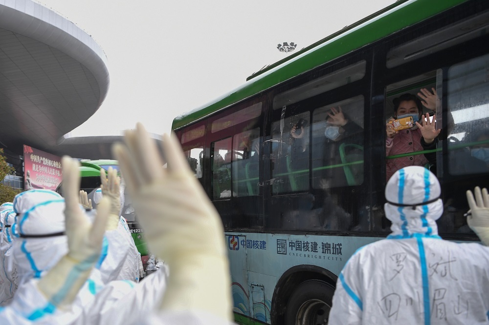 四川省第四批援助湖北医疗队队员秦立祥(左)与队员向着自己曾管理的病区单元挥手作别。记者 杨树 摄