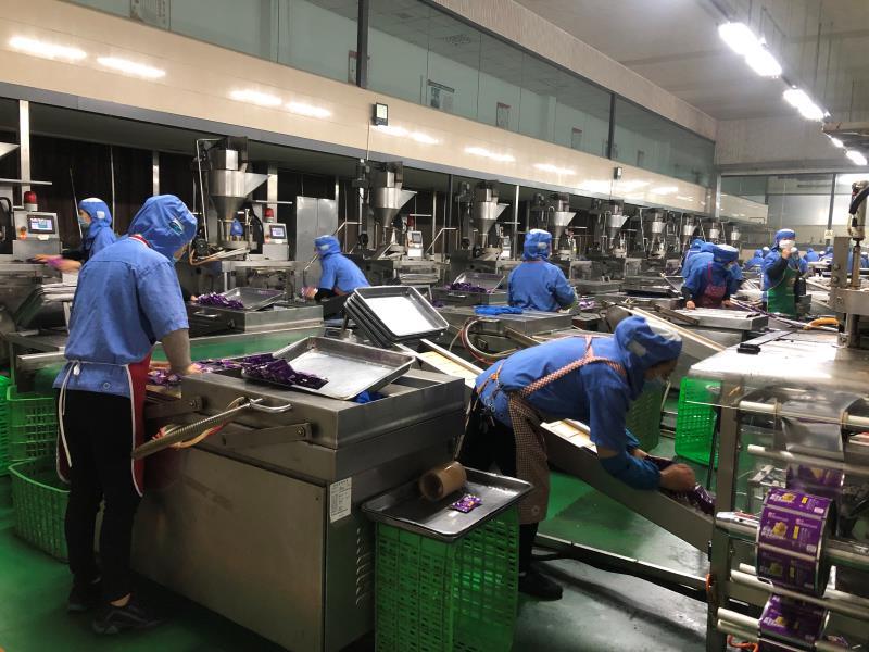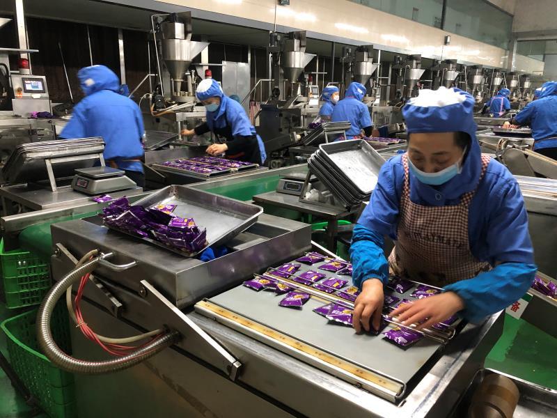 3月9日,位于什邡市马井镇光华村的四川道泉老坛酸菜股份有限公司生产车间里,80余名戴着口罩的工人正在生产线上赶制方便面酸菜调料包,现场一派热火朝天的生产景象。