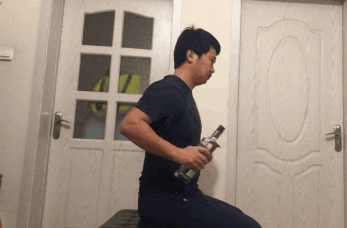器材:无靠背坐凳,哑铃(可用矿泉水替代)