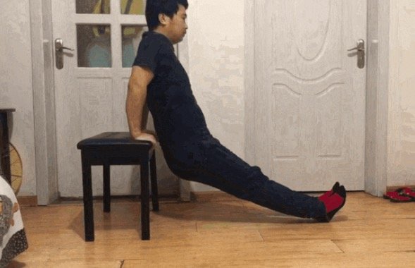 双手放在臀部两侧,手指朝前抚床沿坐于床边,躯干保持挺直,双脚并拢直膝放于身前,伸直双臂支撑身体,重心略前移使臀部离开床沿,缓慢屈肘使躯干保持匀速下降,稍作停留后原轨迹伸肘推起,重复进行。