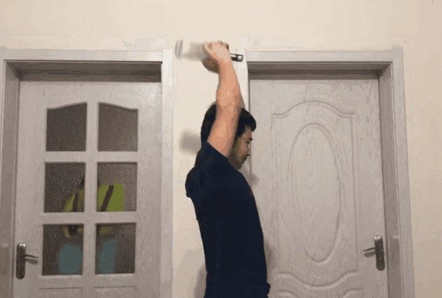双手握紧水瓶举过头顶,大臂尽量贴近耳朵,尽可能快的大幅度摇动水瓶