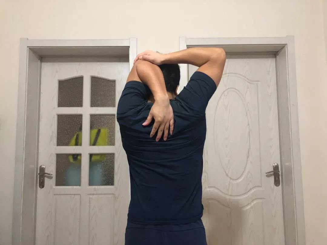 最后,别忘了做一组拉伸(手上举后充分屈肘,另一只手抚上举手的肘关节处向后拉伸,每只手拉伸30s)。