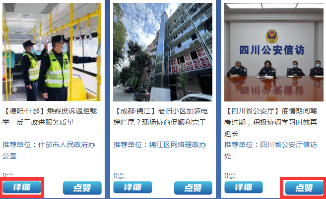 进入点赞页面后,在每个案例下方设有“详细”和“点赞”按钮。