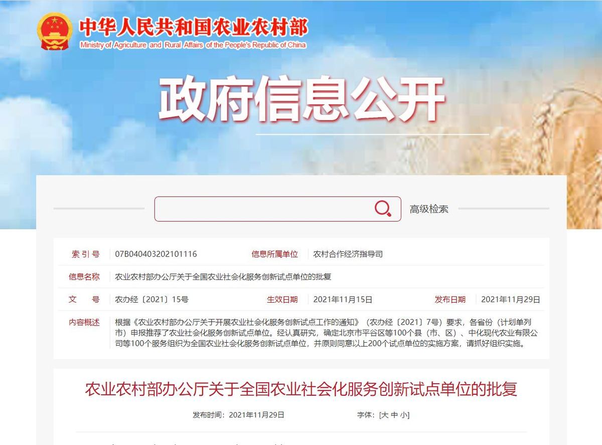 11月29日,农业农村部办公厅发布关于全国农业社会化服务创新试点单位的批复,确定北京市平谷区等100个县(市、区)、中化现代农业有限公司等100个服务组织为全国农业社会化服务创新试点单位。