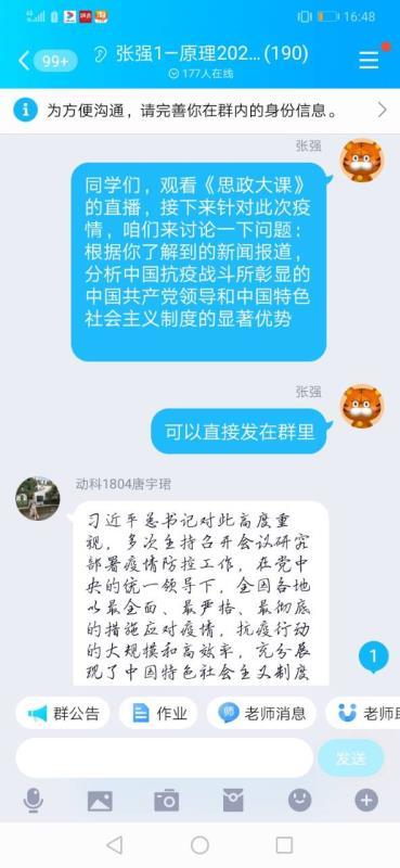 能源学院2018级新能源科学与工程专业薛睿同学表示,这次听课非常感动,我也要向战疫英雄们学习,勇于担当历史使命,将自己的个人梦想和祖国的需要紧密结合,把青春梦想扎根祖国的广袤大地,与时代同步伐,与人民共命运。