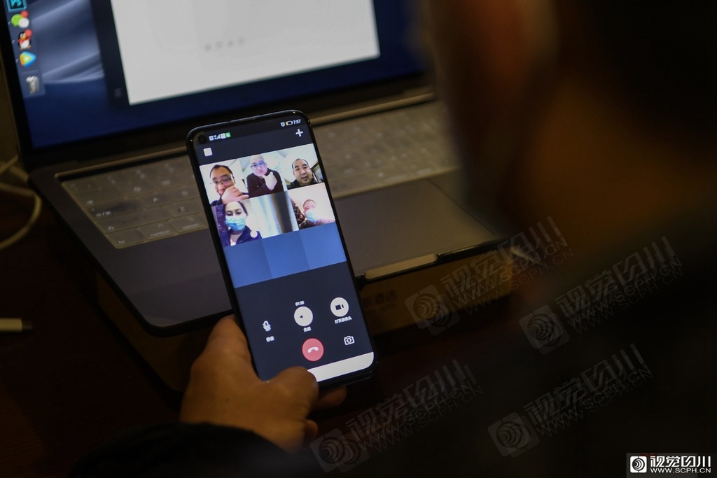 四川第四批援助湖北医疗队队员彭端亮在房间里与家人视频。