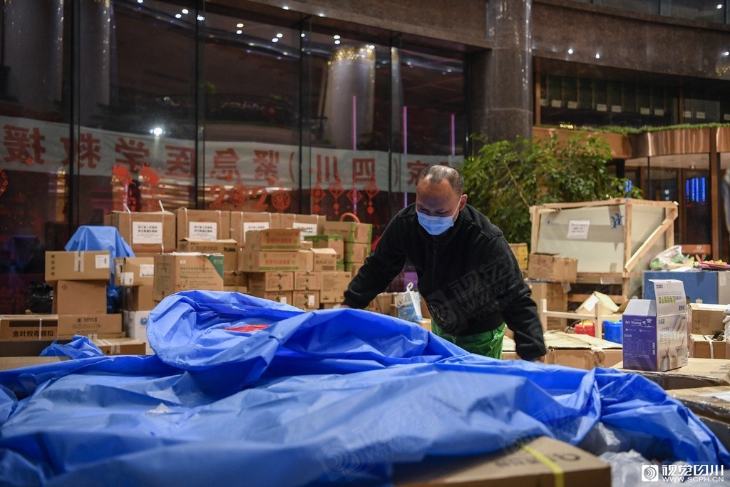 四川第四批援助湖北医疗队队员陈谦整理队伍里的物资。