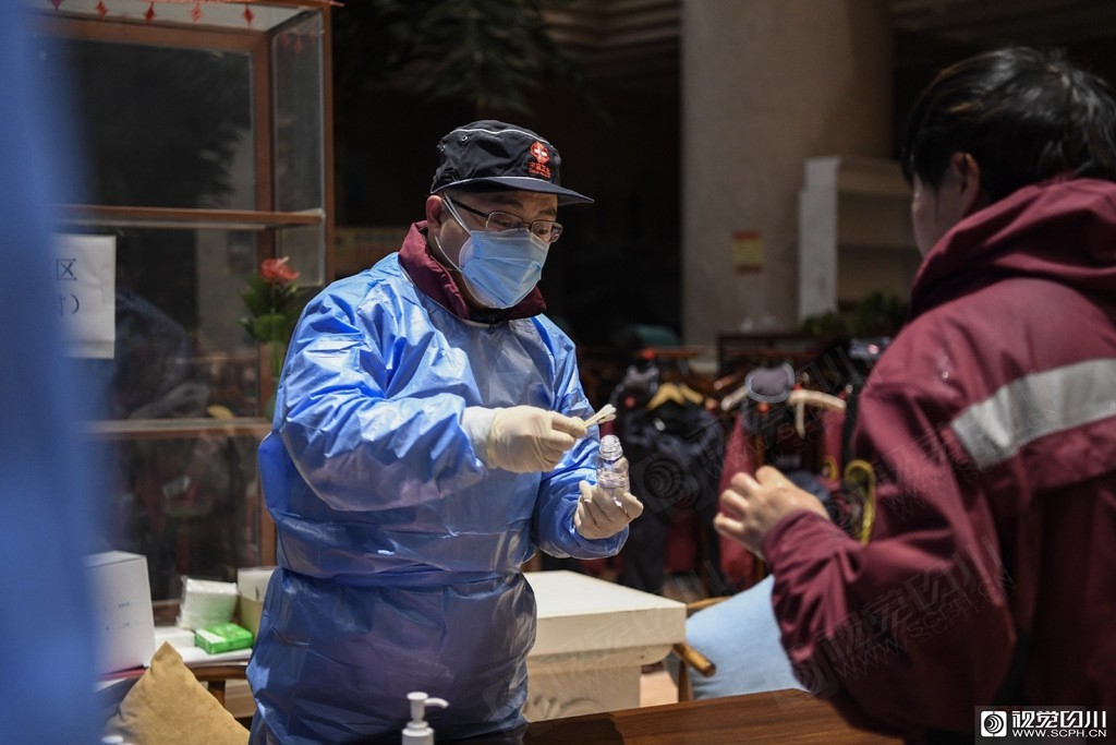 四川第四批援助湖北医疗队队员宋龙超准备将衣服送去洗衣房。