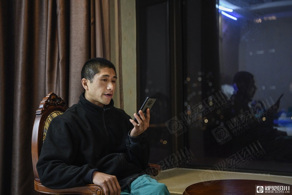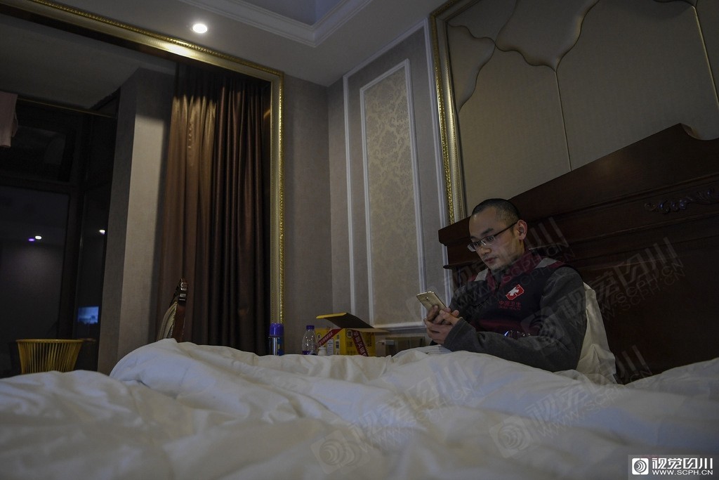 四川第四批援助湖北医疗队队员廖俊先在房间里玩手机打发时间。