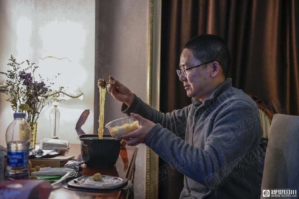 四川第四批援助湖北医疗队队员秦岭下班后自房间吃饭。