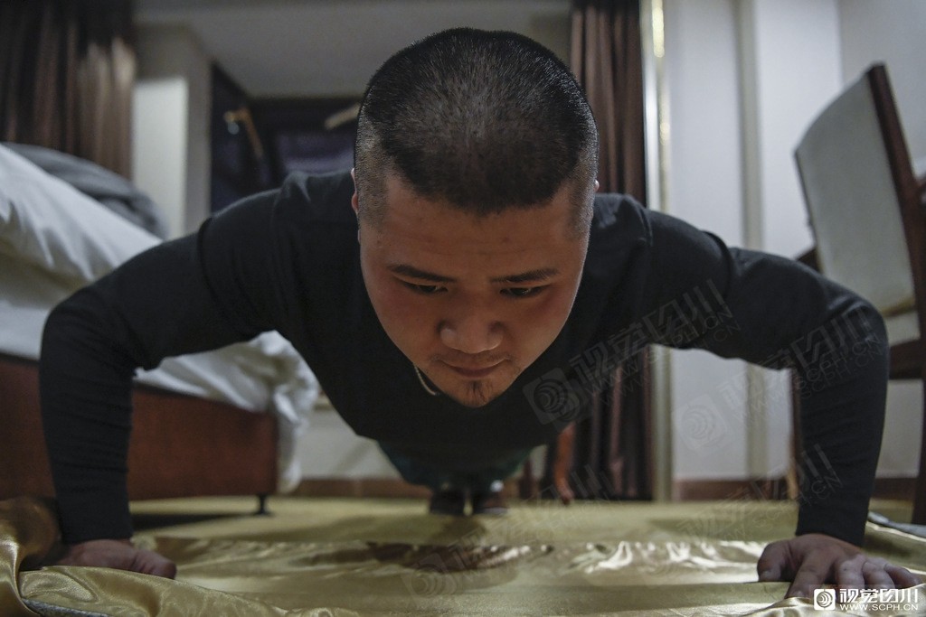 四川第四批援助湖北医疗队队员苏玓在房间里做运动。