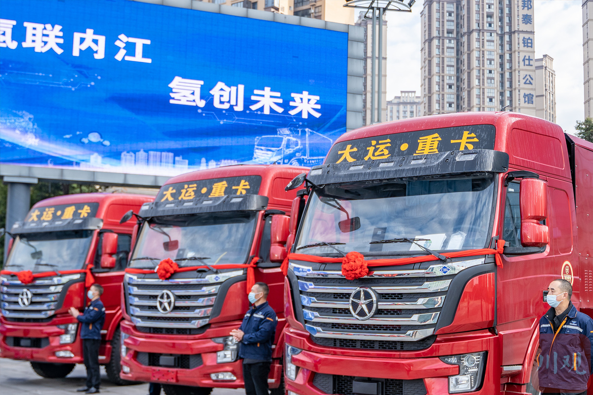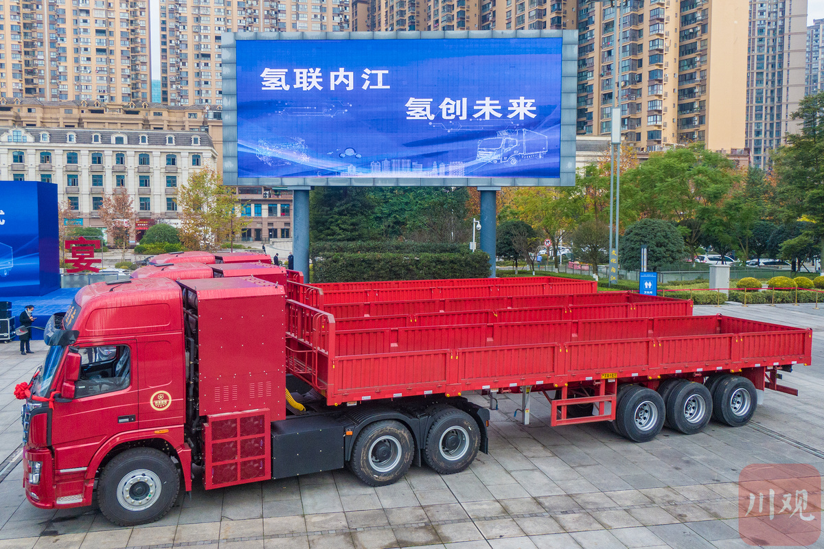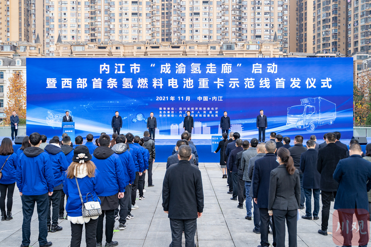 助力碳达峰、碳中和,抢抓“成渝氢走廊”建设机遇,内江在行动。11月30日上午9时20分,一辆辆氢燃料电池重卡汽车从内江国际会展中心驶出,标志着西部首条氢燃料电池重卡示范线在内江正式运营。当天,四川省和重庆市在成都、九龙坡区和内江三地同时举行“成渝氢走廊”启动暨氢燃料电池物流车首发仪式。
