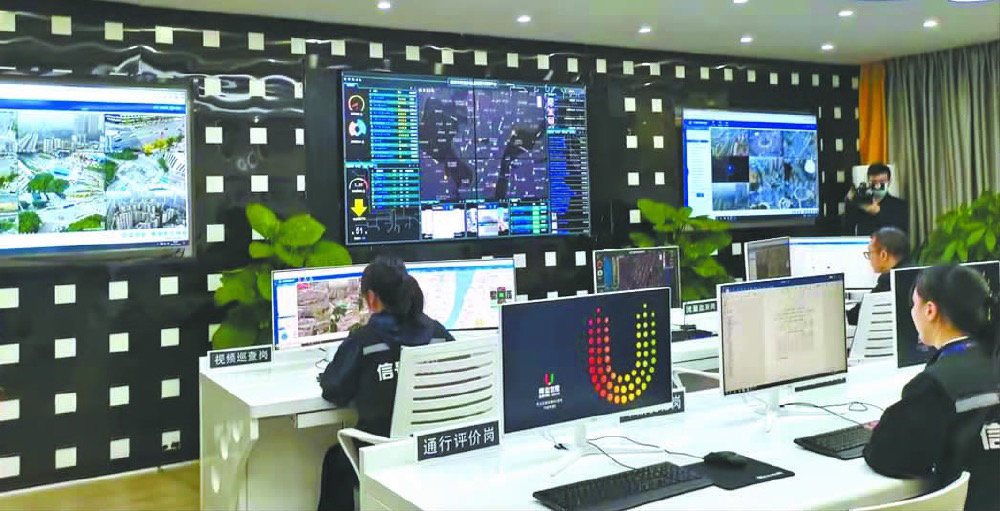 在南充市公安局交警支队智慧交通信号控制中心一块块大屏幕及电脑屏幕上,清楚显示着主城区各条道路和各个路口的交通情况。