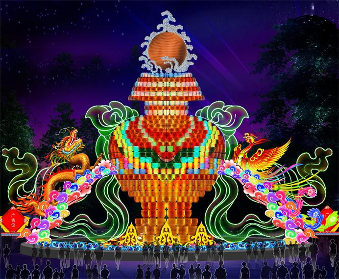 据悉,首届中国·荣县佛文化灯会超大型灯组《吉祥佛陶宝瓶》以佛教八宝中的“宝瓶”为创意设计元素,首次采用具有千年历史的荣县制陶工艺与自贡灯彩制作技艺相结合,采用10000个土陶罐和10000个土陶莲花瓣、10000个LED灯进行创意融合,经特殊处理后捆扎成灯,灯组长25米、高18米,为游客带来一场美轮美奂、流光溢彩的视觉盛宴。该灯组将申请吉尼斯世界纪录。