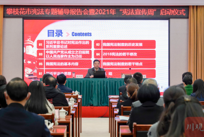 11月30日,川观新闻记者从攀枝花市宪法专题辅导报告会暨2021年“宪法宣传周”启动仪式上了解到,在今年“宪法宣传周”期间,攀枝花市举办7场主题活动,让宪法进农村、进社区、进校园、进机关、进企业、进军营、进网络。