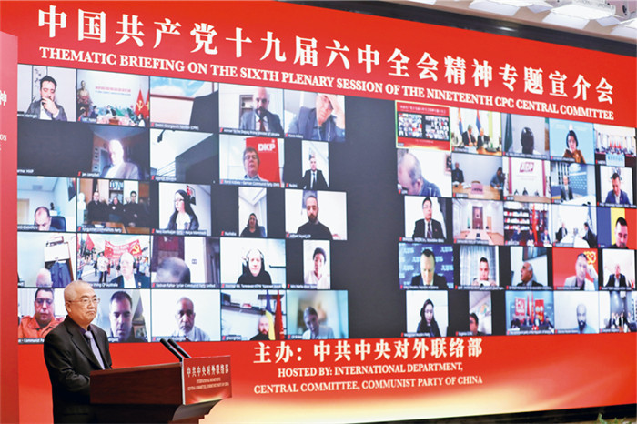 2021年11月19日,中共中央对外联络部以线上线下相结合的方式举办中共十九届六中全会精神专题宣介会。来自全球160多个政党和组织机构的500多位代表以及近100位在京驻华使节出席。图为中方专家在北京作宣讲。 中新社记者 蒋启明/摄