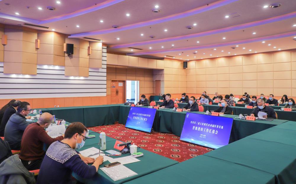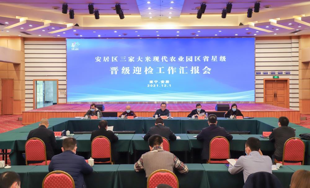 汇报会上,安居区从优化生产体系、健全产业体系、创新销售体系、理顺效益体系、完善组织体系等五个方面,详细汇报了三家大米现代农业园区建设情况。
