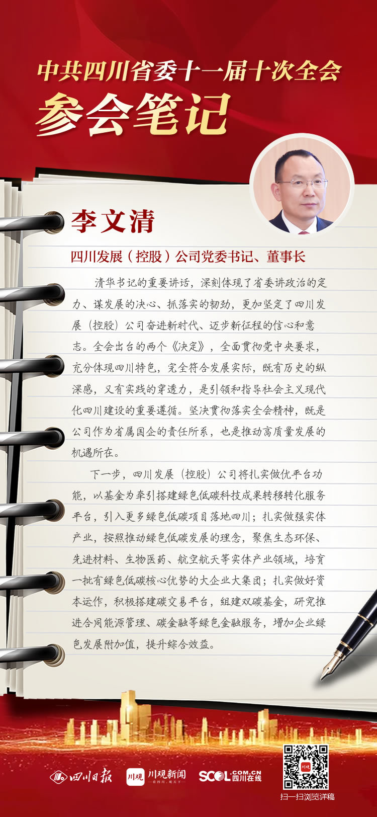 清华书记的重要讲话,深刻体现了省委讲政治的定力、谋发展的决心、抓落实的韧劲,更加坚定了四川发展(控股)公司奋进新时代、迈步新征程的信心和意志。全会出台的两个《决定》,全面贯彻党中央要求,充分体现四川特色,完全符合发展实际,既有历史的纵深感,又有实践的穿透力,是引领和指导社会主义现代化四川建设的重要遵循。坚决贯彻落实全会精神,既是公司作为省属国企的责任所系,也是推动高质量发展的机遇所在。