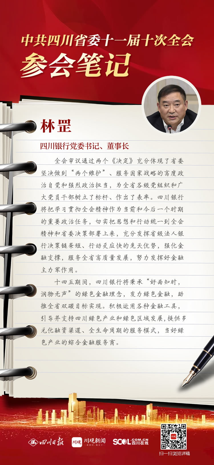 全会审议通过两个《决定》充分体现了省委坚决做到“两个维护”、服务国家战略的高度政治自觉和强烈政治担当,为全省各级党组织和广大党员干部树立了标杆、作出了表率。四川银行将把学习贯彻全会精神作为当前和今后一个时期的重要政治任务,切实把思想和行动统一到全会精神和省委决策部署上来,充分发挥省级法人银行决策链条短、行动反应快的先天优势,强化金融支撑,服务全省高质量发展,努力发挥好金融主力军作用。