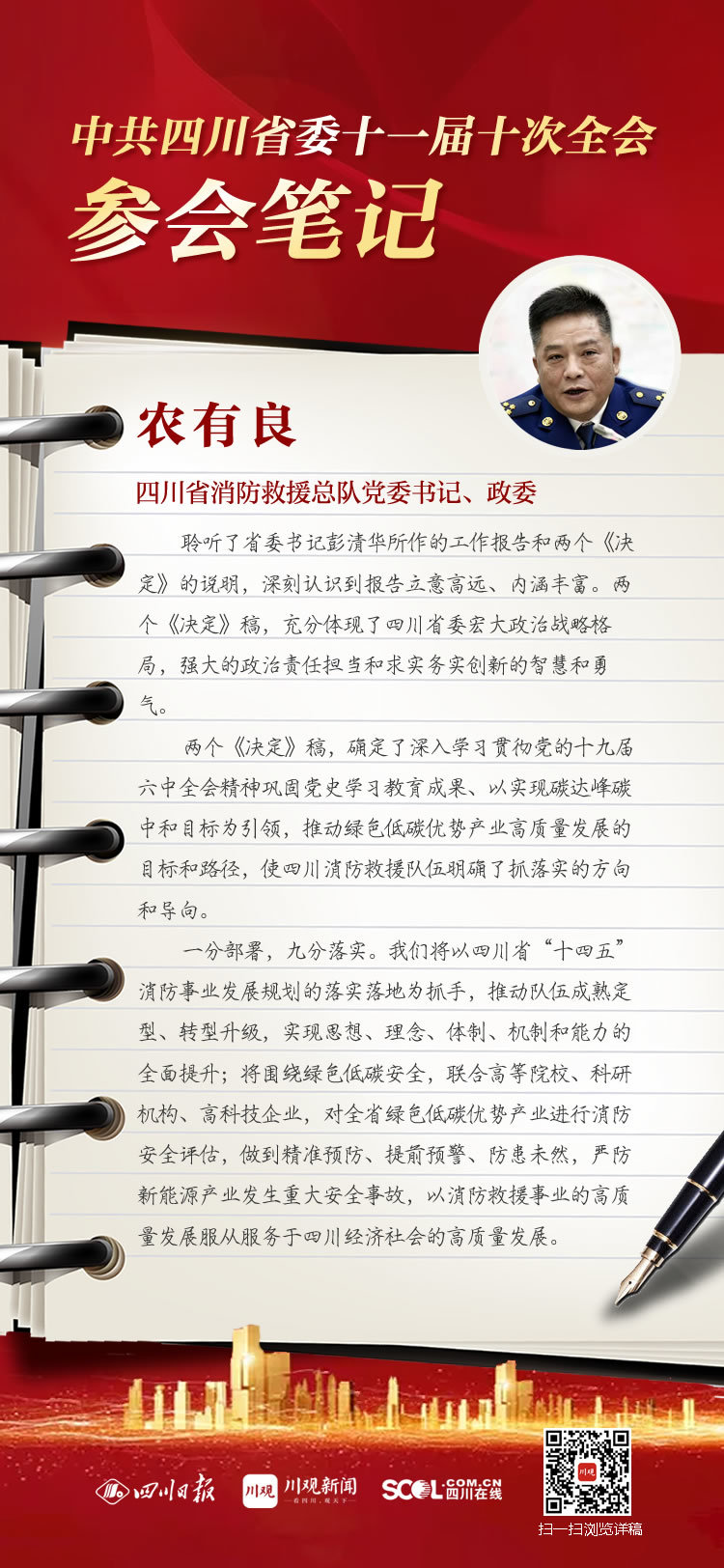 两个《决定》稿,确定了深入学习贯彻党的十九届六中全会精神巩固党史学习教育成果、以实现碳达峰碳中和目标为引领,推动绿色低碳优势产业高质量发展的目标和路径,使四川消防救援队伍明确了抓落实的方向和导向。
