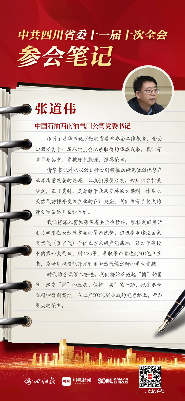 清华书记对以双碳目标为引领推动绿色低碳优势产业高质量发展的论述,让我们深受启发。四川出台相关决定,正当其时,是着眼于未来发展的大谋划。作为以天然气勘探开发为主业的在川央企,我们为有了更大的舞台而备感自豪和幸运。