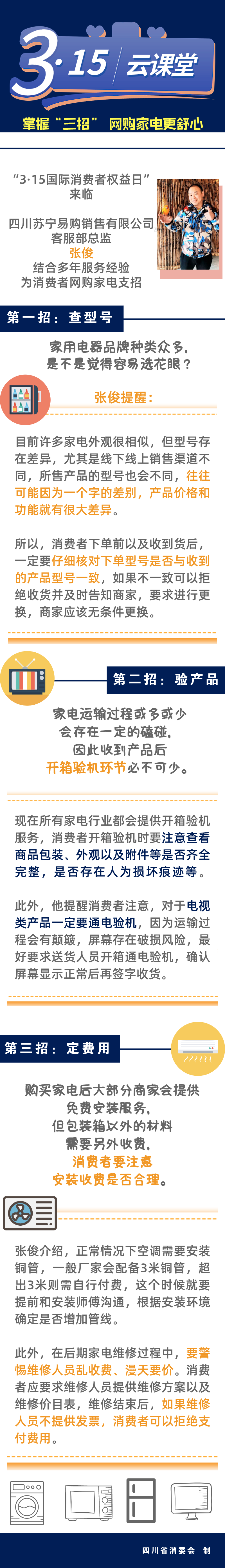 “3·15国际消费者权益日”即将来临,省消委会和川报观察推出的的【3·15云课堂】,特别邀请到四川苏宁易购销售有限公司客服部总监张俊,为消费者网购家电支招。