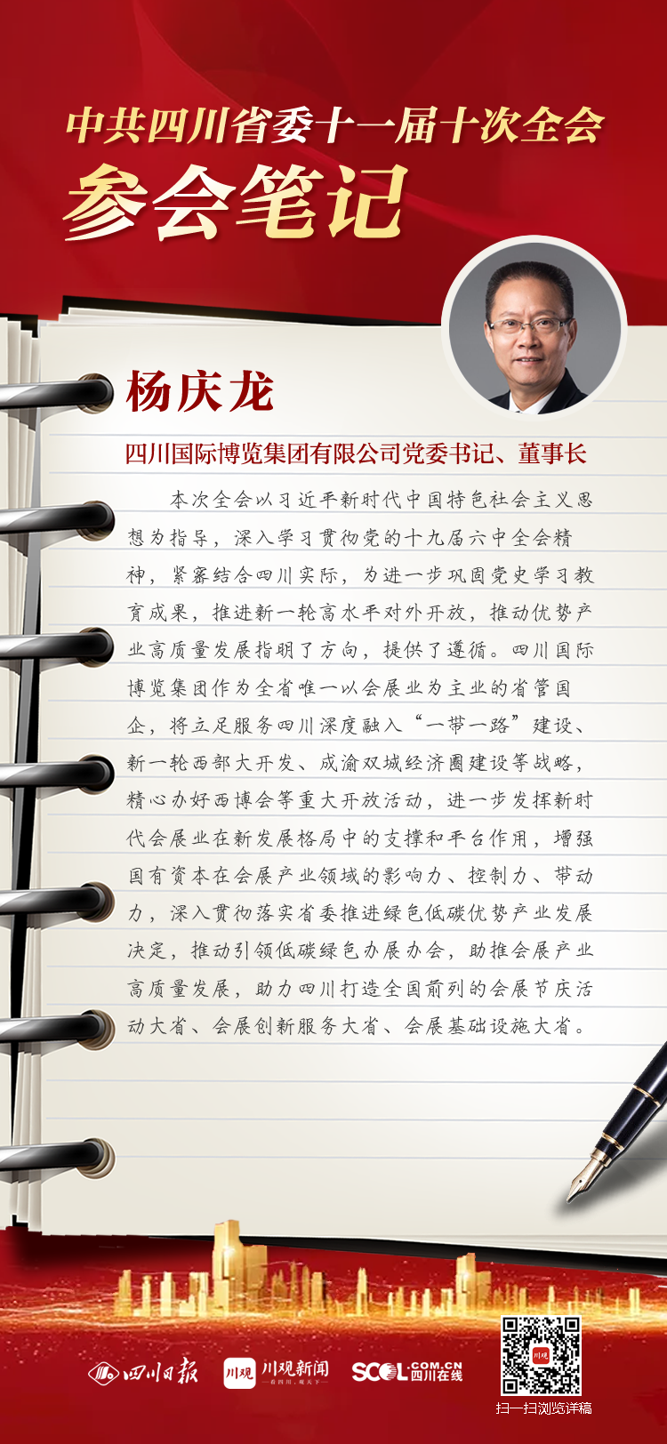 本次全会以习近平新时代中国特色社会主义思想为指导,深入学习贯彻党的十九届六中全会精神,紧密结合四川实际,为进一步巩固党史学习教育成果,推进新一轮高水平对外开放,推动优势产业高质量发展指明了方向,提供了遵循。四川国际博览集团作为全省唯一以会展业为主业的省管国企,将立足服务四川深度融入“一带一路”建设、新一轮西部大开发、成渝双城经济圈建设等战略,精心办好西博会等重大开放活动,进一步发挥新时代会展业在新发展格局中的支撑和平台作用,增强国有资本在会展产业领域的影响力、控制力、带动力,深入贯彻落实省委推进绿色低碳优势产业发展决定,推动引领低碳绿色办展办会,助推会展产业高质量发展,助力四川打造全国前列的会展节庆活动大省、会展创新服务大省、会展基础设施大省。