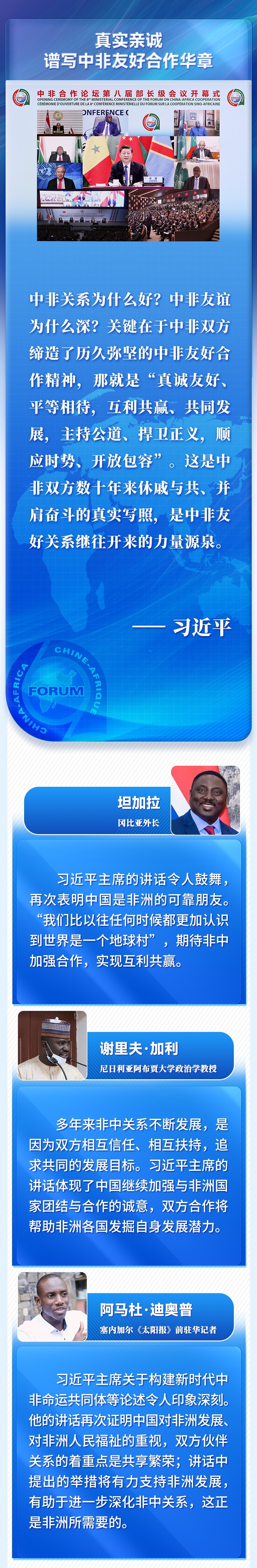 中非关系为什么好?中非友谊为什么深?关键在于中非双方缔造了历久弥坚的中非友好合作精神,那就是“真诚友好、平等相待,互利共赢、共同发展,主持公道、捍卫正义,顺应时势、开放包容”。这是中非双方数十年来休戚与共、并肩奋斗的真实写照,是中非友好关系继往开来的力量源泉。